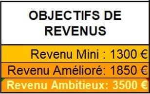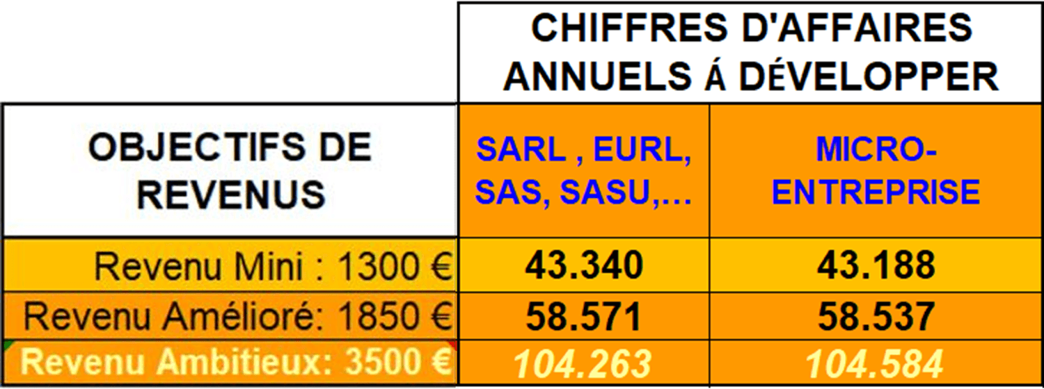 Ci-dessus le tableau qui vous sera livré dans votre GPS d'Entreprenant. Il établit les Chiffres d'Affaires à réaliser pour atteindre vos objectifs de revenus ou de salaires net.